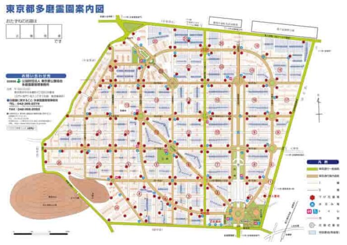 新宿の西方約20km、緑に囲まれた武蔵野の面影を残す霊園。面積は128ヘクタールと都立霊園の中で最大の規模を誇ります。この霊園は海外の森林墓地を参考にして作られたわが国最初の公園墓地であり、わが国初の都市計画共葬墓地として知られています。園内には芝生墓地や壁墓地、大規模納骨堂や合葬墓地など様々な形態の墓地があり、各界の著名人墓所も多く、視察や散策に訪れる人も多い霊園です。